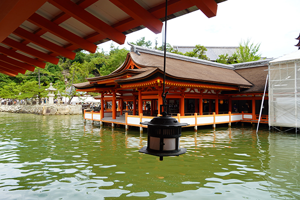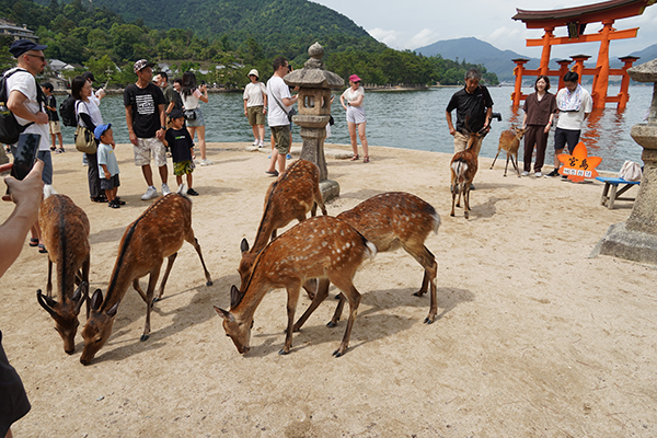 我和爸爸下了遊覽車,搭上渡輪前往世界遺產之一的嚴島神社。不過尚未上岸,搶人眼球的紅色大鳥居便性急的闖入視線。根據領隊所說,紅色大鳥居它完全是靠自己的重量來佇立在海上,這使我不禁咋舌,這重量真是不得了。上岸後,迎接我們的是調皮又貪吃的小鹿們。在前往神社的路上,有不少人在跟小鹿們玩、合影,但也有幾個人在休息的時候不小心讓身上的物品成為小鹿的點心。