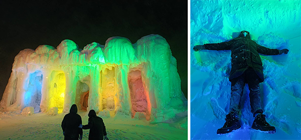 因為想一探雪的真貌,昨晚尚未滿足的我們一行人便早早起床,在五點便出飯店去玩雪,當時的氣溫只有零下24度,導致連眼鏡都凍起來了。在吃完飯店獨具特色的早餐後,第一站便是去湖上的雪屋看冰雕以及足湯。