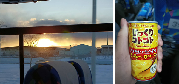 在前往飯店的路上,太陽已經下山了,這時才下午四點!可把我嚇了一大跳,路上遇到了一個休息站,我們停下來買了一瓶溫暖的玉米濃湯,這是第一次在販賣機中買到熱的物品,非常新奇~在車上嚮導也讓我們品嘗了當地的美食”天婦羅”,是由魚漿所蒸製而成的。