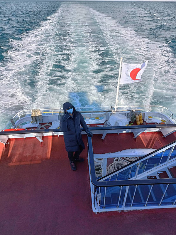這下一站前往這次旅行的重頭戲-----破冰船!是要乘坐觀賞用的破冰船前往鄂霍次克海欣賞由俄羅斯飄下來的流冰,幸運的是,當天天氣十分好,視野廣闊,為了取得更好的視野,我們還乘坐了特等席(在船頭的部分)。這也是久違的一次坐船,這次居然不太會暈,海面上波光粼粼的十分耀眼,可惜的是,除了剛出海有一點小冰塊以外,其餘就什麼都沒看到了。