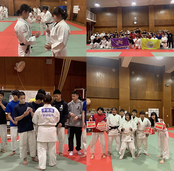 我第一次跟日本學生練習對摔,心裡真的很緊張,因為我的日文不好,不知道怎麼溝通,只能用些簡單的英文跟比手畫腳來解釋,例如一些簡單的自我介紹自己是國中三年級I am third grade of junior high school.還有很高興能來這裡學習Very happy to study here,跟在做一些動作時問對方我做的對不對Is my action correct?。幸好,教練很會說日文,幫我們當翻譯,後面在練習就好很多了,第一次在日本道場練習,發現他們的熱身方面做得很足夠,練習防守壓制也很強,跟我在學校練習的有很大的不同,可能是文化的差異吧,我覺得日本的學生練習都超級認真,超級有活力,讓時間過得很快。