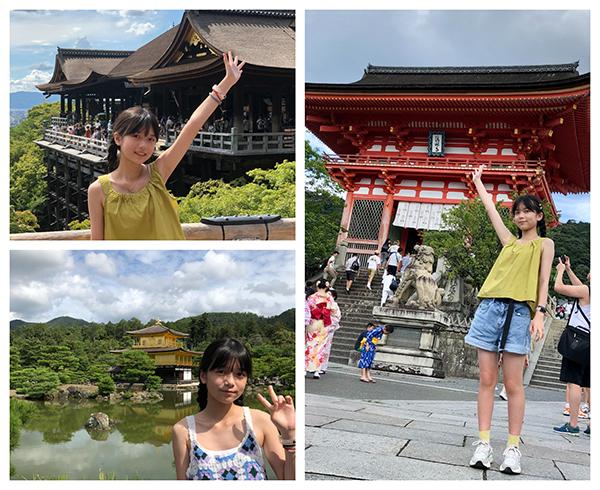 一口牛奶、一口優格,早餐享受著日本最出名的乳製品,台灣牛乳的腥味在日本牛乳中消失殆盡,喝起來滑順可口;油脂飽滿、鮮美的烤秋刀魚,也是日劇中三餐的必備品,不像台灣的魚總是乾口、不夠濕潤。初次拜訪神社,有很多規矩要了解,例如鳥居是神明與人類的結界,也是神明坐騎的休憩地,因此在跨入之前要懷抱著虔誠的心,敬禮再踏入鳥居。參拜前的洗手要先洗左手,再洗右手,最後用左手盛水洗口。還有參拜前必須投硬幣與神明結緣,想投入多少錢也和台灣一樣,會根據吉利的諧音決定金額,例如十円代表日語的「重緣」。投入硬幣後,要「二禮二拍一禮」,先敬禮兩次,再拍手兩次,接著許願,最後再敬一個禮。千萬不可以像台灣拜拜一樣搖手,會變成「乞討」!進到伏見稻荷神社,排排站的鳥居成了一條隧道,陽光在其中縫隙穿透閃耀,畫面顯得夢幻不已。蓋一個最小的鳥居就要花費高昂的費用,因此沿路都是公司行號的鳥居。神社周圍常看到神明的使者――狐狸的雕像,口中銜著不同東西,各有不同的祝福寓意,銜著稻穀和穀倉鑰匙的是祈求豐收、銜著寶玉則是代表富貴等。繞了伏見稻荷神社一圈,已經汗如雨下、衣服濕透了,不禁好奇日本明明緯度較高,怎麼感覺比台灣熱得多?原來是因為我們的所在地京都,是盆地地形,夏天的熱氣不易散發,不僅悶熱,甚至沒有風!接著拜訪三大神宮之一――平安神宮,看見地上鋪滿了小石子,導遊解釋在日本鋪上小石子的用途有三種:第一種是因為古代日式城堡中的城主擔心忍者暗殺,因此在地面鋪上小石子,縱使步伐輕盈,小石子仍會摩擦發出聲響,或許能救城主一命;第二種則是在神社、廟宇,儀式服裝的裙襬通常都長至及地,下雨天時若是沒有小石子,裙襬直接接觸地上的濕泥巴,不僅髒兮兮的,還可能對神明不敬重;第三種是因為樹根需要呼吸,若是鋪柏油,可能會讓大樹「缺氧而死」!遠近馳名的清水寺,果然滿滿的都是人群,不過看見清水舞台下方支撐的139根櫸木後,心中只剩下佩服古代匠工技術的想法了。後來走到商店街內,買了一根檸檬醃黃瓜,直接啃食,消暑又解渴!在坐遊覽車去花見小路的路上,發現京都的公車都是統一造型,沒有貼任何廣告單,十分整潔乾淨。但日本的計程車卻是鮮明的紅黃綠,各種顏色都有,車頂燈也有各種可愛的小圖案,例如四葉草、大象等,與台灣一致化的小黃造型相反。以及日本的景觀法規定古蹟附近的房屋都不可以超過古蹟本身的高度,屋頂的顏色也都有統一規定,讓古蹟附近的區域在視覺上一致化。日本和台灣一樣,都是受地震所苦的國家,因此公路上的高架橋支柱特別粗,是用防震水泥製成的。在路途中我也看到日本住宅的陽台是和鄰居共用的,但為了隱私,兩間房中間仍有使用一塊板子隔開,而且若是有緊急狀況發生,只要踢破那層板子,就可以從鄰居家逃生。一路上聆聽了多日本在地化的介紹後,終於抵達花見小路,藝妓在一個個小巧復古的店面裡招待貴賓,也因為保護顧客不要在光顧店面時被偷拍,造成心理壓力,整條街道都不能拍照。接著到附近的相撲火鍋吃晚餐,享用道地的京都豆腐,綿密的口感跟台灣嫩豆腐的滑溜口感大相逕庭。吃完到附近的公園走走,路上都是赤松和黑松,也充斥著烏鴉的叫聲。我也好奇為何日本路上如此多電線桿,原來是因為日本地震很嚴重,若是將電線埋在地底,要搶救時還得挖開地面,更加多此一舉。廟宇、店家的屋瓦上都有一個可愛的造型,這不僅是特色,也是象徵防火的神明,讓日本的木造建築都能免於祝融。不只是防火的鬼瓦,還有財神爺的造型!晚上入住御宿野乃溫泉飯店,在各種不同功效的溫泉裡浸著,放鬆身心,身體也暖和起來了!泡完溫泉,穿上浴衣和木屐襪保暖,讓溫泉的熱度保留在身上。