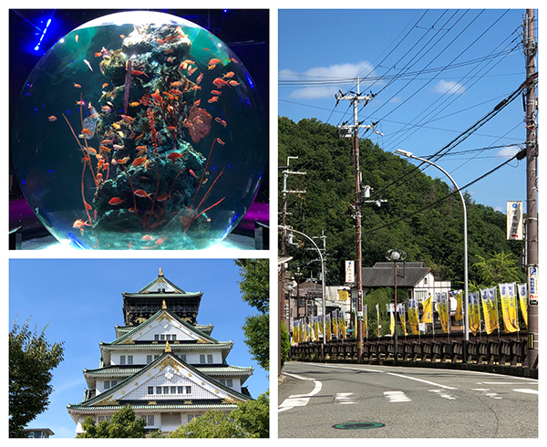 三大古泉之一——有馬的鐵質溫泉,和台灣濃厚的硫磺味不同,清新乾淨,將腳浸在裡面,也能放鬆一直走路的疲倦,泉水因為氧化的鐵,有些泛紅。當地的特產是碳酸煎餅,我在看製作過程時,裡頭的工作人員打開窗戶遞給我一個熱呼呼的煎餅,十分薄脆。大阪著名的建築便是大阪城,天守閣主體的藍綠色配上金色的雕花,還有象徵魚躍龍門的裝飾,在陽光下閃閃發光,大門前的巨石是德川家康為了讓人臣服、震懾人心所放置的裝飾品,在以前沒有汽車、貨車的時代,他使用人工的技術將一塊比我還高的巨石運到門前,實在是令人佩服。古時,周圍還有護城河,可見豐臣秀吉很注重自己的安全,也擔心自己的榮華富貴會被奪走。公園內有一個半圓形的突起——時光膠囊,把我們使用的東西、生活物品埋在地底,等到100年後再讓當時的人類打開,真是一個有趣的點子,不知道未來會發展成什麼樣子呢?晚間到知名的跑跑人固力果的所在地:心齋橋與道頓崛逛街,人山人海,店家想要凸顯自己的特色,便看見了許多特別的立體招牌,有章魚燒、牛、螃蟹等,五光十色!吃下道地的日式章魚燒,覺得比起台灣的完整球型,日式的相對軟濡許多,章魚也比較大塊。