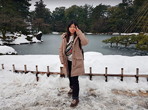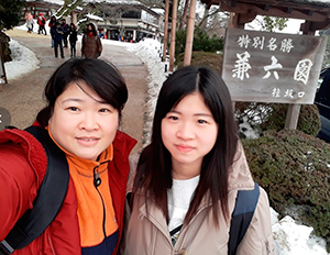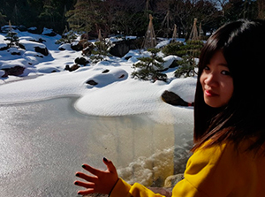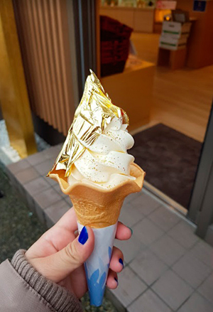 第一個景點是兼六園,進去後看到了一大片的雪,冷冽的溫度讓湖面也結成了冰,裡面的庭園景色真的不錯,而且範圍超大走滿久的!參觀完出來後,我們去附近買了金澤的金箔冰淇淋,拿在手上一直捨不得吃下去,吃完亮亮的金箔還會賴在牙齒上不走,我跟媽媽都變成了大金牙囉~