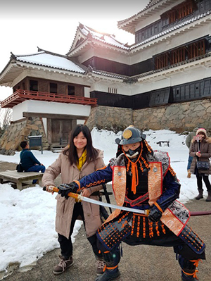 介紹完以後,下一站我們前往松本城,一開始從外面走進來看到松本城和旁邊的護城河,那景色真的美到可以ㄟ!果然有濃濃的日本古代城堡的味道,不愧是幾百年的歷史古跡,在通往城堡的路上還有穿著日本武士服的志工阿伯,很熱情的與我合照,還比出拔劍動作,超開心的。