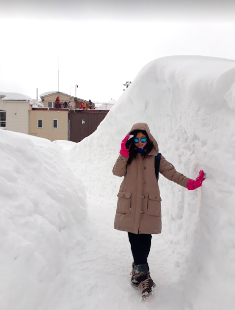 很幸運的天氣還不錯,可以看到整個山景,到了最上面後,有個雪壁迴廊讓我們走,那雪牆真的很高,差不多有2m的高度,在那邊散步的感覺很放鬆,我還直接趴在雪牆上!真的滿舒服的耶!躺久了居然會有點小睡意~