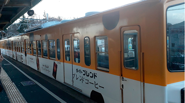 最後一站我們去體驗搭日本的電車,上車一坐在椅子就有熱熱的感覺,原來是椅下都有暖爐,看著街景有種自己就住在日本的感覺。