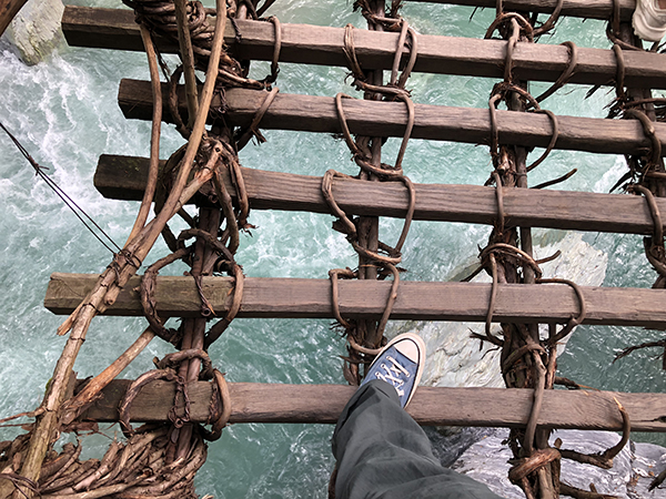 但行程還沒有要讓我們遠離大步危峽的意思,沿著吉野川旁蜿蜒的山路,還能看到有人在溪谷中泛舟。在此之後抵達的是日本三大奇橋之一,僅用藤蔓編製的葛藤橋!雖說很多人來這個景點是為了欣賞大步危與小步危的自然風光,但我在過橋的路上真的是怕得要死,完全沒有心情欣賞風景,因為橋底的縫隙是真的有夠大的。