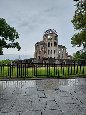 乘船回遊覽車,第二站來到的是來到廣島絕對不能錯過的原爆遺址。冒著雨近距離看到殘存的圓頂型建築,那破敗的樣子十分觸目驚心,使人禁不住的震撼與省思。可是與之十分衝突地,在其周遭卻是與日本其他地方無異,上空也有不少烏鴉盤旋,不禁令人驚嘆大自然其恢復速度竟然是如此地強大。