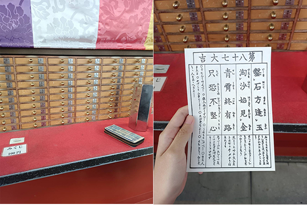 走在古老的街道上,感受到日本傳統文化的厚重,這裡充滿了歷史的氛圍。在淺草寺抽到一支大吉籤的驚喜,讓我覺得這次旅程中充滿了美好的小幸運。