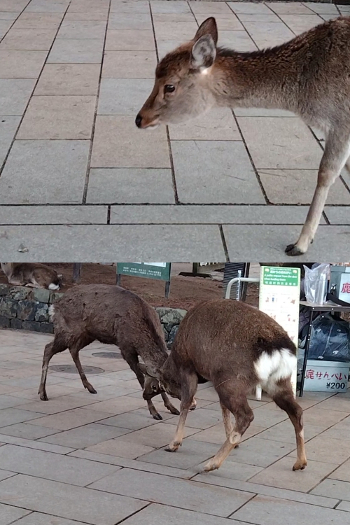 往外走便是【奈良公園】,一踏入公園變看到四處都是悠閒自在在散步的超可愛梅花鹿,據說他們的鹿有1200頭,是日本梅花鹿最集中的地方。因為我的身高其實並不高,鹿的高度差不多位在我的臀部,一隻一隻鹿的衝上前,其實難免還是會有些害怕的,於是我們並沒有買飼料去餵食鹿,光是站在中間就感受得到群鹿環繞的感覺啦!還差點被鹿追著跑,甚至意外看到有兩隻鹿在打架,實在是新奇又驚險的體驗,也是本次日本遊我最喜歡的景點,誰不喜歡動物呢~~