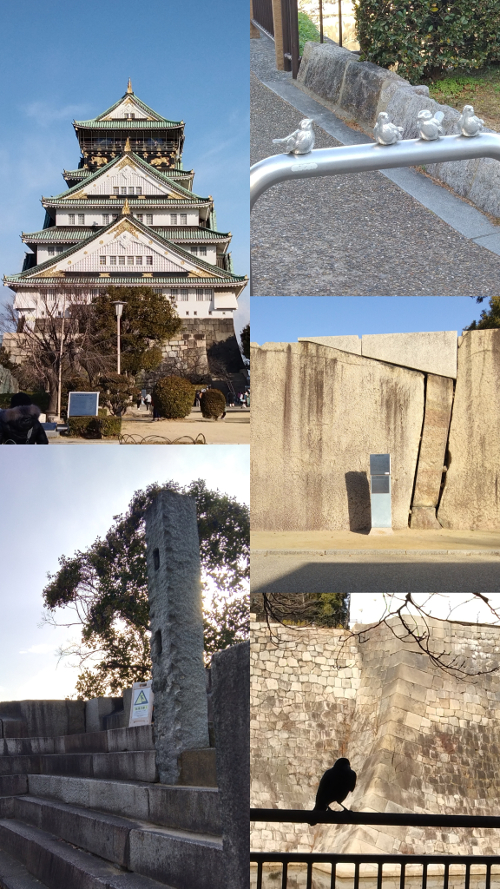 今日的第一站是來到【大阪城-天守閣】,屋頂上裝飾著巨大的「金鯱」造型頭瓦,金碧輝煌,走廊中還鑲嵌有純金飾品。建造者是一名偉大的武士-豐臣秀吉。 遠遠走來,就能感受到這棟歷史古物的豪華氣息。一進入大阪城公園,就讓我發現到,日本的烏鴉真的好多哦!四處都可聽見「哇——哇——」的烏鴉嘶啞聲,看到一群烏鴉一起飛過去的場面比比皆是,而且那些烏鴉都不會怕人的! 公園中還具有櫻門枡形的蛸石,它可是大阪城內最大的巨石哦!!古時是用來在敵人闖進城門時,能將敵人包圍住攻擊的利器,親眼看見有如高牆般的巨大石頭,讓我蠻震撼的。 往內走還可見到當時用來架槍的石柱(洞洞內就是放槍的位子)。