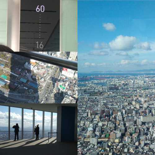 接著去到【HARUKAS300展望台】,可是日本第一高的展望台哦!!「300展望台」此名的由來是因觀望台位於大樓300公尺處。建築採用地下5層,地上60層的設計。通往頂樓的電梯很酷!裡面有很像電玩遊戲裡會出現的音效~還有七彩的燈光,外邊也是透明的可以往下看。上去之後,最先入眼看到的是萬尺高空,一望無際的藍天白雲。後從60層居高臨下的全景落地窗往下俯瞰,大阪、神戶、京都各地的美景盡收眼底,一棟一棟的房子有如樂高積木一般的縮小了~