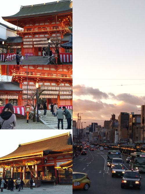 再來去到的是【八坂神社】,對於驅邪、去病、生意興隆的祈願據說非常靈驗。 整座神社的裝潢非常氣派,主殿在2020年時被指定為國寶。 在夕陽襯下金光閃閃,熠熠生輝,落日的餘暉打在殿堂上,竟有種令人心生畏懼的感覺,現場看非常震撼,飽受眼福~ 我覺得旁邊的舞殿也很美!一整排的紙燈籠非常吸引我。