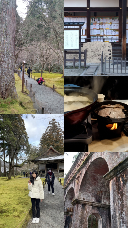 接著去到了位於鴨川及高野川之間的三角地帶的【下鴨神社】,裡面最著名的是求姻緣的相生社與河合戀愛神社,單身的可以去拜一下!! 日本人參拜神明的方式是:二拜二拍手一拜。說到鴨川,遊覽車開過去時的,裡面是真的有鴨子耶!聽說以前的鴨子是整條川滿滿皆是。