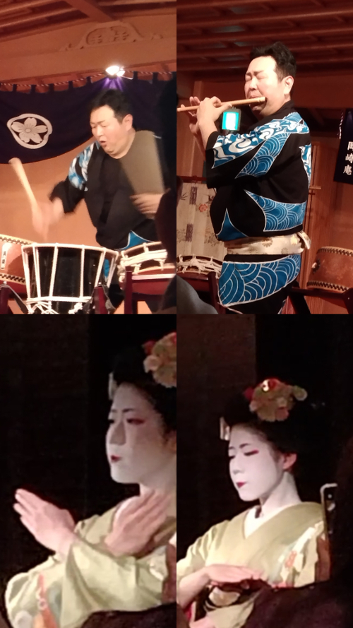 最後的藝妓表演是和晚餐一起享受的,不知道看著美女吃飯會不會消化比較好XD? 她們真的把臉塗的好白哦,連身體上也都是厚厚的人體水彩,據藝妓本人說,她們每天的飲食都是由藝妓學校來提供,為了控制體重吃得都很清淡,不得擅自吃外食。我光想想就...覺得好痛苦,人生當然就是要吃阿!!