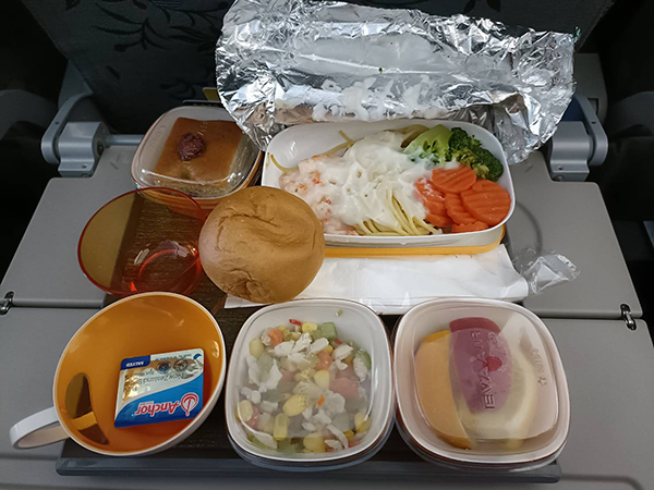 曾在生物課學過,因為高空中人的味覺敏銳度降低,於是飛機餐比地面上的食物更重口味,餐點比我想像中的豐富許多,但就如傳聞中一樣很鹹。