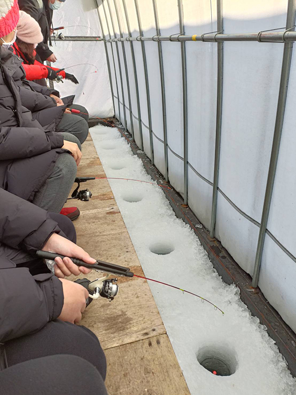 由於雪上摩托車是四輪著地的,所以即使是像我這樣沒有摩托車經驗的新手也可以輕鬆駕馭,阿寒湖十分的廣闊,即使以時速30公里騎乘了5分鐘還是沒有抵達湖中央。釣公魚特別的地方是,他垂放釣餌的地方是在湖面上鑿出一個圓孔並垂釣下去的,雖然很可惜並沒有釣到,但這次的經驗也十分難得。