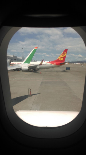 隔天早上並沒有起個大早,可能是昨天熬太晚所致。我帶著滿滿的希望和祝福與我的父親一同前往機場出發日本,從車上看出的風景,讓我有些不捨,不捨向台灣道別,但正當我仍沉醉於思念時,已經到了。這是我第一次來,難免有些好奇,東看西瞧,但到最後才發現大廳不等於登機門,費了不少力才和導遊會面,在登機時真的超緊張,通過一道道的海關和安檢,才抵達登機口,並且如願以償地坐到靠窗的座位,在經過漫長等待塔台的指揮後,我感覺一股極強大的推力使我駛前,慢慢地壓力減輕飛機緩緩離開了地表,離開了台灣。向上翱翔,穿越了對流、穿越了雲層,視野從桃園到台灣,最後至一片汪洋,鳥瞰台灣乍然發現福爾摩沙是如此的美豔動人:小小的村舍,繞著小溪,還有綿綿白雲點綴;路上的行車沿著海岸線迂迴,過往的船隻在尋覓港口靠岸,可惜不能親臨體會浪潮帶來的海水鹹味,和汽笛大作的船鳴聲。雲上的世界很平穩、安詳,沒有氣流的擾動,但時光飛逝,時差讓太陽跑得更起勁,降落日本的途中,夕陽的餘暉灑落在大阪灣上,和關西空港相映成趣,這應該是日本的一種歡迎吧!