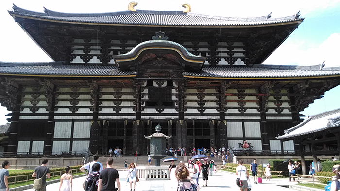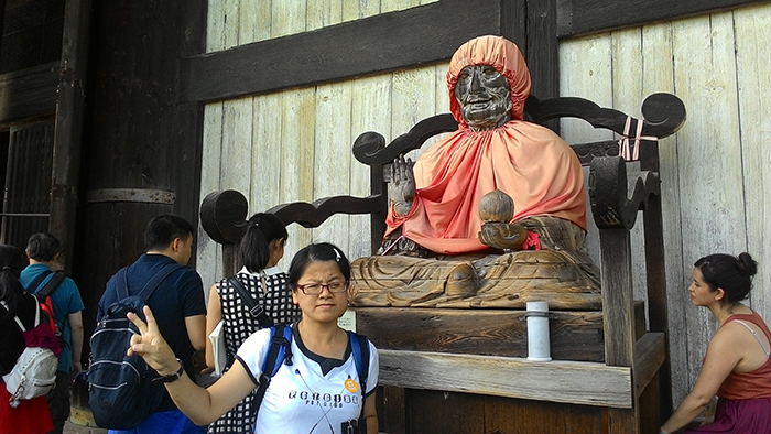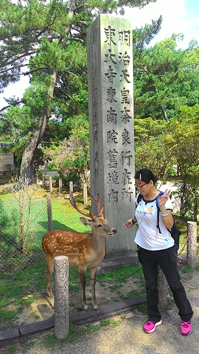 到了東大寺,要拜拜看佛祈求自己的健康之前,都要淨身,不管是神社還是佛寺,先洗左手,再洗右手,再漱口,最後再洗桿子。不過我覺得重心應該都擺在看梅花鹿,四處都有梅花鹿出沒,可以餵食,平常都不會和鹿那麼接近,媽媽好像既期待又怕受傷害一樣,被鹿的瞬間動作給嚇到,但又很喜歡鹿,噗哧一笑的我在旁觀察媽媽和鹿的一舉一動,媽媽的表情如今想起來還真經典。