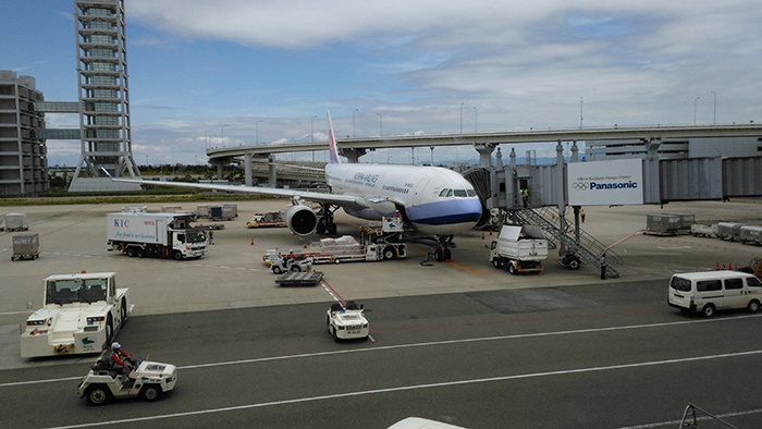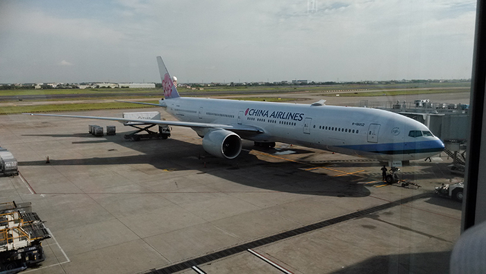 接著我們第一次寄行李,看著我的行李在黑色的傳輸帶上慢慢的運過我回來台灣後才知道的瑕疵x光機,導遊跟我們說要記得看螢幕檢查自己的行李是否有問題,沒事才可以離開去下一道關卡──海關。要出海關時,看到如同電影情節所演的情形,要把東西全摘下來,東西和人都要過x光機,幸好沒有東西卡關,安全通關!到了候機室時,看到這台華航的飛機,真的是比想像中還大台,