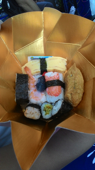 一下飛機後,我們就立即前往奈良東大寺,在車上享用精緻的花壽司,餐盒是用一種特殊的摺法做的,而醬油是用魚的造型下去做的,別有一番風味,導遊還說吃壽司最正統的方法是用手拿,我心想既然來到日本,就要好好體驗一下當地吃法!