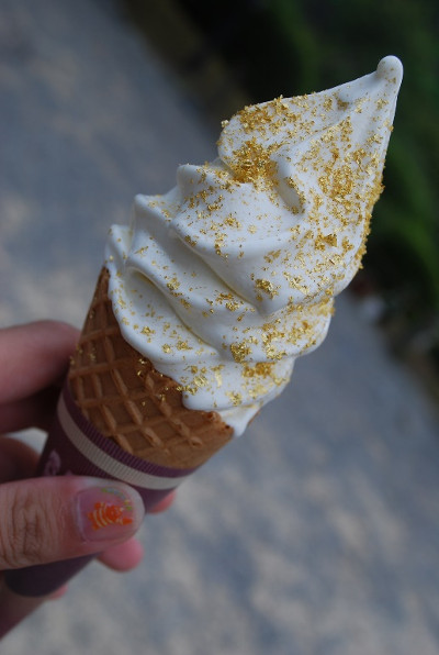 下個景點是兼六園 位於金澤市中心,是日本式庭園典範,江戶時期所建,園內有不同季節開花的植物,所以春夏秋冬四季都都有不同的感覺,我們還吃了撒上金箔的牛奶冰淇淋。