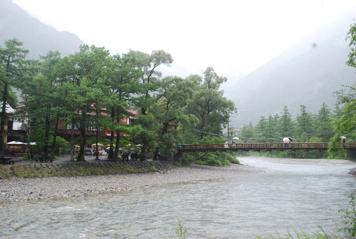 第三天,一早搭了近兩個小時的車到上高地,卻下了雨,因為上高地也有海拔1500公尺,天氣濕濕冷冷地,這的名稱意思是<此等的美景是神賜予我們的禮物>,因為下雨路面都是積水不好走,雖然下著噢,但河童橋下的溪水卻依然清澈,公共廁所也將原本的男女,換成了紅色和藍色的河童,因為下雨就只有到處拍照就回到室內了。接著約三個小時的車程抵達名古屋,雨還是下不停,傍晚是最期待的自由逛的時間,到了榮町商圈,得牢牢記著自己剛剛走過的路線,對這人生地不熟,心裡除了買東西還要記得回去的路呢!!